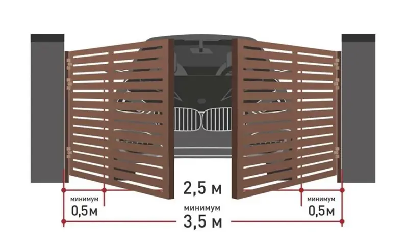 Для легковых машин оптимальная ширина ворот составляет 3–3,5 метра, для грузовых и спецтехники — от 3,5 до 4 м, а для двойного проезда — от 5,5 м. Если пространство ограничено, ворота можно сдвинуть вглубь участка на 1–1,5 м.