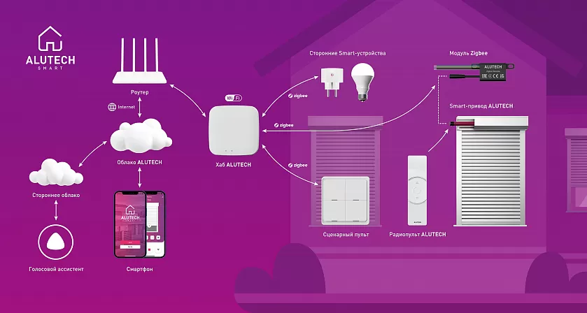 ALUTECH Smart функционирует на базе экосистемы умного дома Tuya. Обмен командами, а также информацией между смартфоном пользователя и смарт-устройствами осуществляется посредством хаба (центр умного дома), работающего на протоколе Zigbee*.