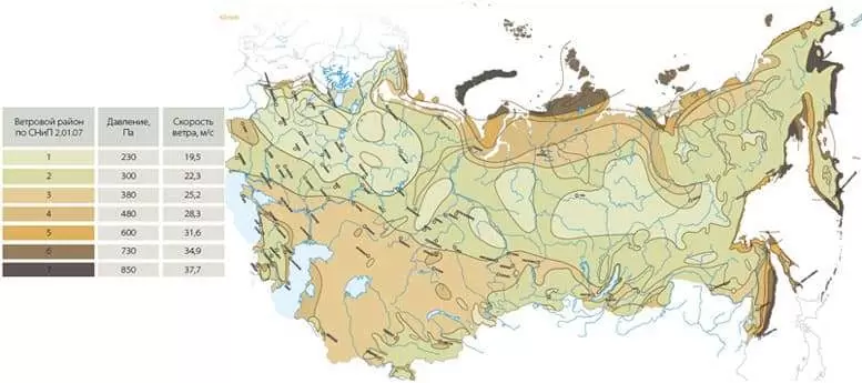 На территории СНГ выделяют 8 ветровых районов. Ветровое давление в них варьируется от 170 до 850 Па, скорость ветра – от 16,8 до 37,7 м/с.