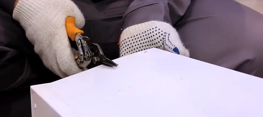 - Разметьте и одновременно просверлите отверстия диаметром 4,2 мм в передних отбортовках боковых крышек и крышке короба (по 2 отверстия с каждой стороны короба для последующей установки заклепок).