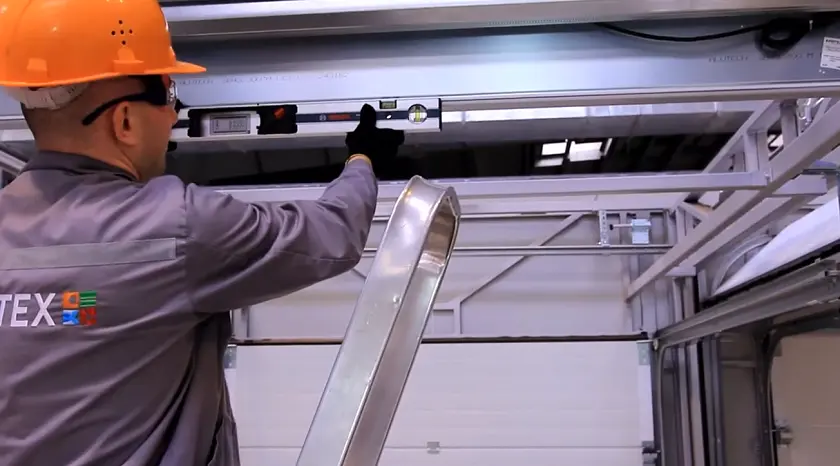 - Выставьте направляющие шины строго вертикально, защитный короб — горизонтально, а всю конструкцию — симметрично относительно проема.
