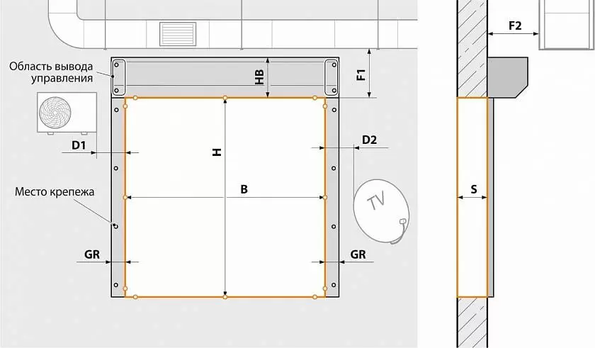 В области монтажа должны отсутствовать элементы, которые могут помешать монтажу, например, трубы, воздуховоды, светильники, кондиционеры и т.д.