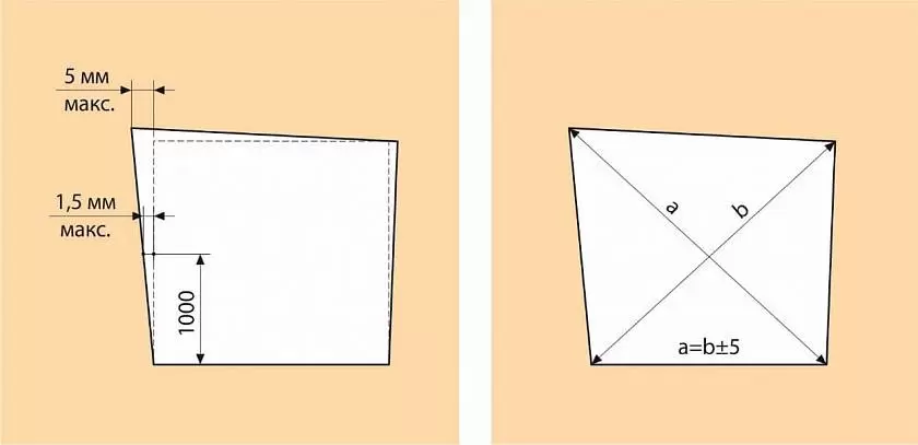 Отклонения поверхностей от вертикали и горизонтали не должны превышать 1,5 мм на метр (в сумме не более 5 мм). Разность диагоналей может составлять не более 5 мм.