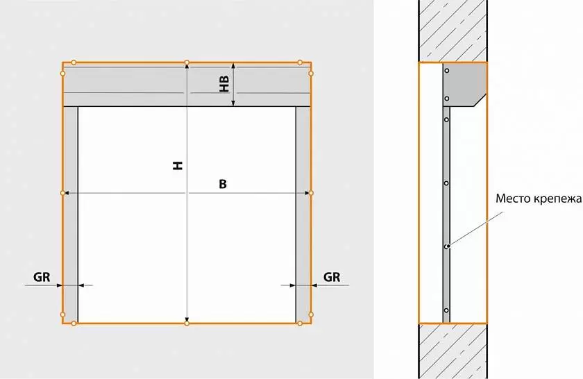Следует учесть, что при встроенном монтаже роллеты перекрывают часть проема. Ширина проема уменьшается с каждой стороны на ширину шины (GR), высота проема сверху уменьшается на высоту короба (HB) и свисающего концевого профиля (если он в проеме).