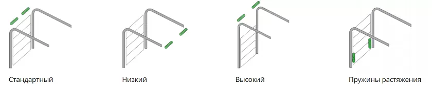 С пружинами растяжения - при таком типе монтажа балансировочный механизм располагается по обеим сторонам вдоль полотна. Минимальная притолока — 100 мм (для ворот с ручным управлением) и 140 мм (для ворот с электроприводом).
