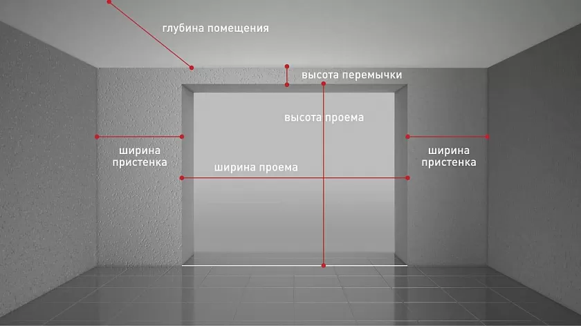 Во время замера необходимо определить ширину и высоту проема, глубину помещения, высоту притолоки, а также ширину пристенков (рис. 1).