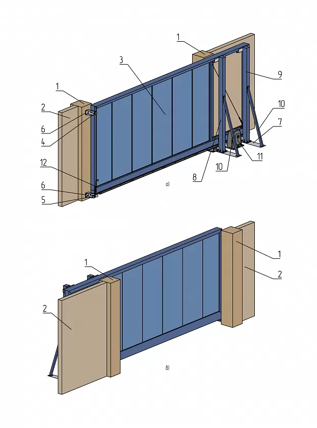 1 — столб проема, 2 — забор, 3 — створка ворот с заполнением и опорами роликовыми, 4 — улавливатель верхний, 5 — улавливатель нижний, 6 — кронштейн для крепления улавливателей, 7 — рама ворот опорная, 8 — столб удерживающий основной с роликами поддерживающими, 9 — столб удерживающий дополнительный с роликами поддерживающими, 10 — раскос, 11 — электропривод, 12 — засов