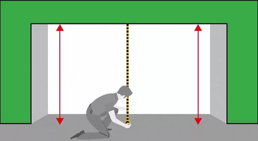 Перед замером следует определить нулевую отметку пола. В идеале устанавливать ворота в проем с уже готовым полом. Замер параметров необходимо производить с внутренней стороны помещения, т.к. с этой стороны будут монтироваться ворота.