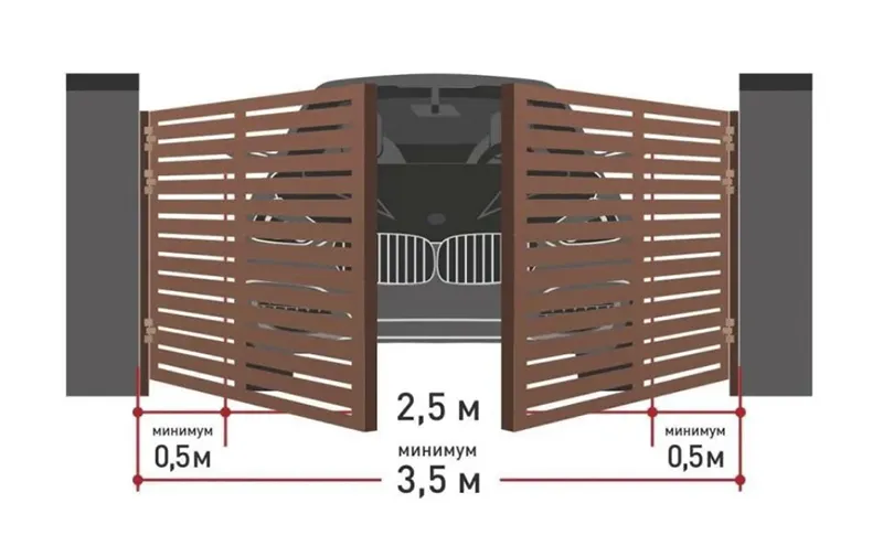Для легковых машин оптимальная ширина ворот составляет 3–3,5 метра, для грузовых и спецтехники — от 3,5 до 4 м, а для двойного проезда — от 5,5 м. Если пространство ограничено, ворота можно сдвинуть вглубь участка на 1–1,5 м.