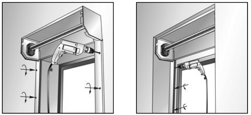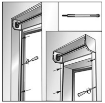 Снимите защитную пленку и установите каркас рольставней на месте их монтажа. Затем просверлите отверстия (диаметром 8 мм) для дюбелей по готовым отверстиям в шинах и коробе.
