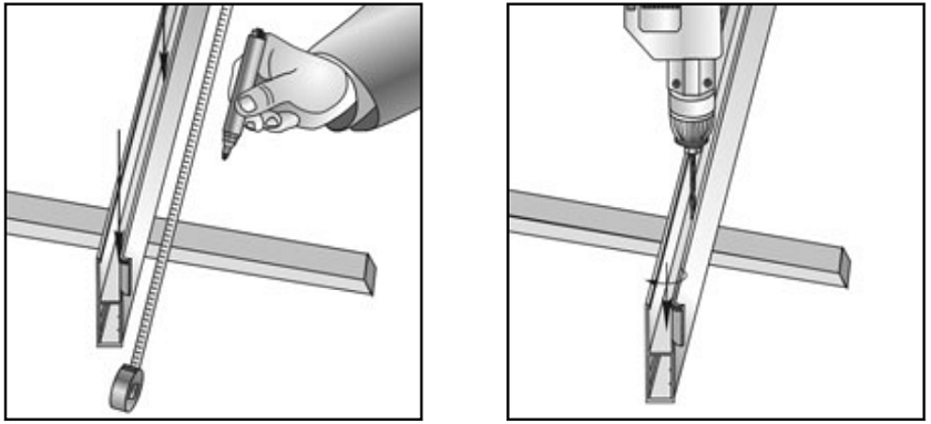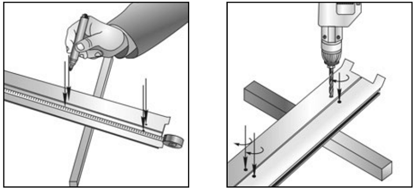 Сначала поставьте отметки на направляющих шинах, а затем просверлите в этих местах отверстия диаметром 8 мм. Нижнее и верхнее отверстия должны находиться на расстоянии 10-15 см от обрезов шины, остальные — на расстоянии 45-50 см друг от друга.