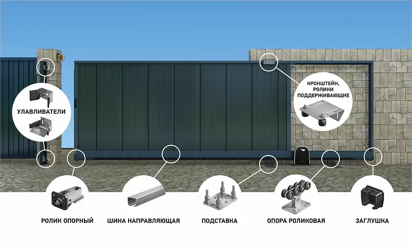 комплектующие (роликовые опоры, опорный ролик, поддерживающие ролики, улавливатели и крышки для них, кронштейны для поддерживающих роликов, кронштейны для улавливателей, комплект засова, ручка);